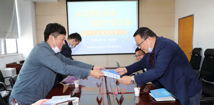 4月27日上午,正值第29個(gè)稅收宣傳月之際,宿遷經(jīng)濟(jì)開發(fā)區(qū)稅務(wù)局張森局長帶隊(duì)來園區(qū)開發(fā)公司宣傳調(diào)研。