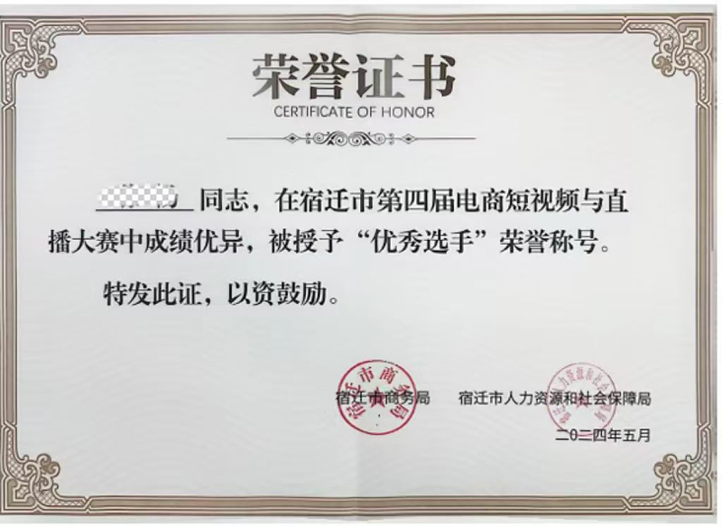 榮譽證書得獲得不僅是對參賽選手個人努力和才華的認(rèn)可,也是對蘇宿電商園在電商領(lǐng)域?qū)I(yè)人才培養(yǎng)和推動電商直播行業(yè)發(fā)展的成果的肯定。