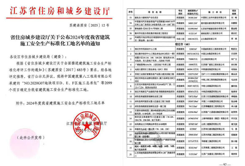 近日,江蘇省住房和城鄉(xiāng)建設廳發(fā)布了《2024年度江蘇省建筑施工安全生產(chǎn)標準化工地名單》,由園區(qū)城發(fā)公司負責建設管理的蘇宿工業(yè)園區(qū)智慧信息產(chǎn)業(yè)園土建及安裝工程位列其中。
